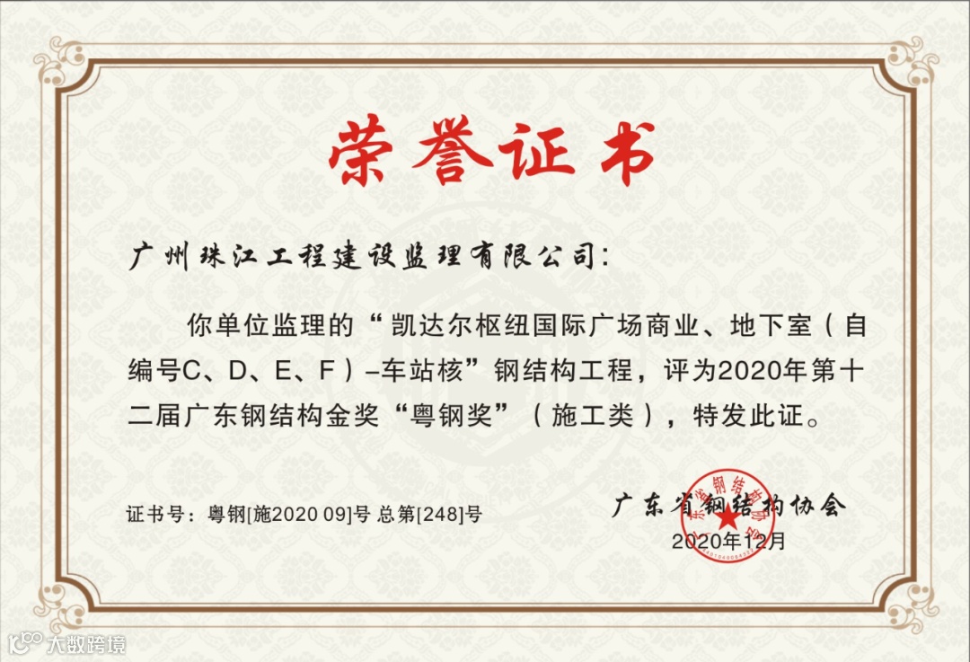 4月19日,珠江监理凯达尔枢纽国际广场项目东站核钢结构工程,被评2020年度第十二届广东钢结构金奖“粤钢奖”。