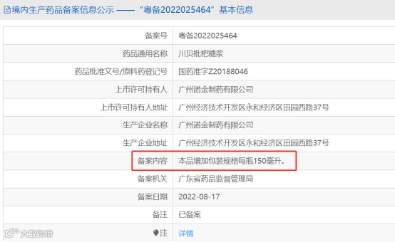 附件2、境内生产药品备案信息公示“粤备2022025464”