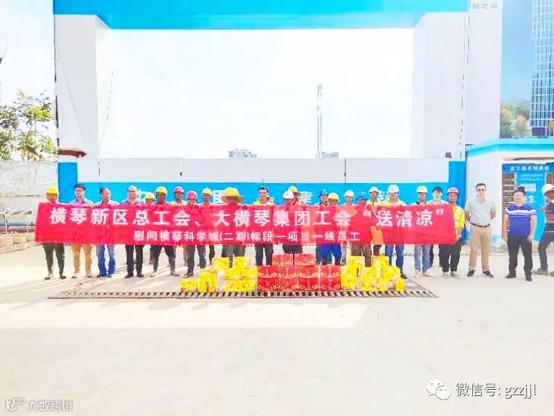 活动中,大横琴工会领导转达了珠海市横琴新区工会领导的慰问信,并代表两级工会对天气炎热高温下仍然坚守在岗位的所有参建单位一线员工和管理人员的辛苦付出表示感谢,并分发了防温降暑用品。