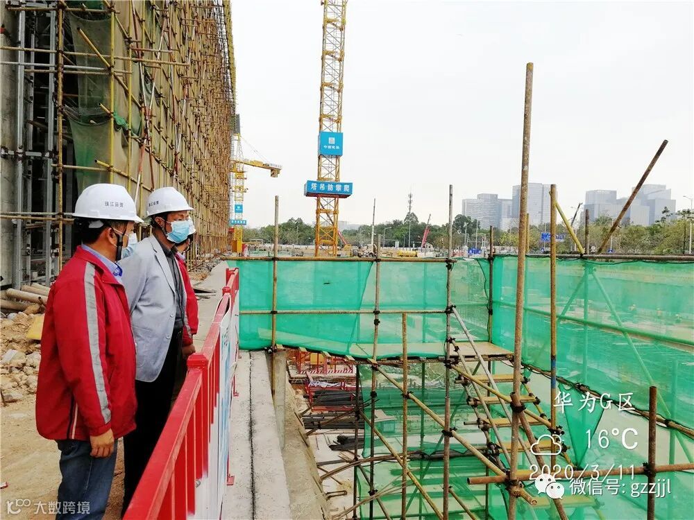 2020年3月11日上午,珠江监理副总经理刘昭民调研华为G区项目,检查项目疫情防控及复工复产工作情况。