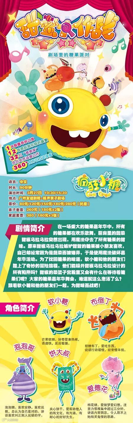 亲子动漫舞台剧《疯狂小糖之甜蜜大作战》,以歌舞音乐剧的形式,讲述糖果们在失去甜味后,携手挑战困难,为找回甜味的真谛而经历的一次既疯狂、又甜蜜的探险旅程。剧目是由获得中国国际动漫节“金猴奖”获奖作品《疯狂小糖》改编而来,并由《猪猪侠》原班人马精心创排。
