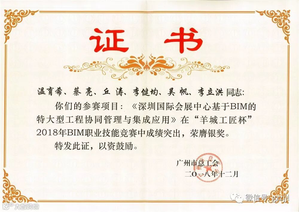 2018年12月21日,珠江监理深圳国际会展中心项目参加由广州市总工会主办的2018年“羊城工匠杯”BIM劳动和技能竞赛,以《基于BIM的特大型工程协同管理与集成应用》荣获2018年“羊城工匠杯”BIM劳动和技能竞赛银奖。