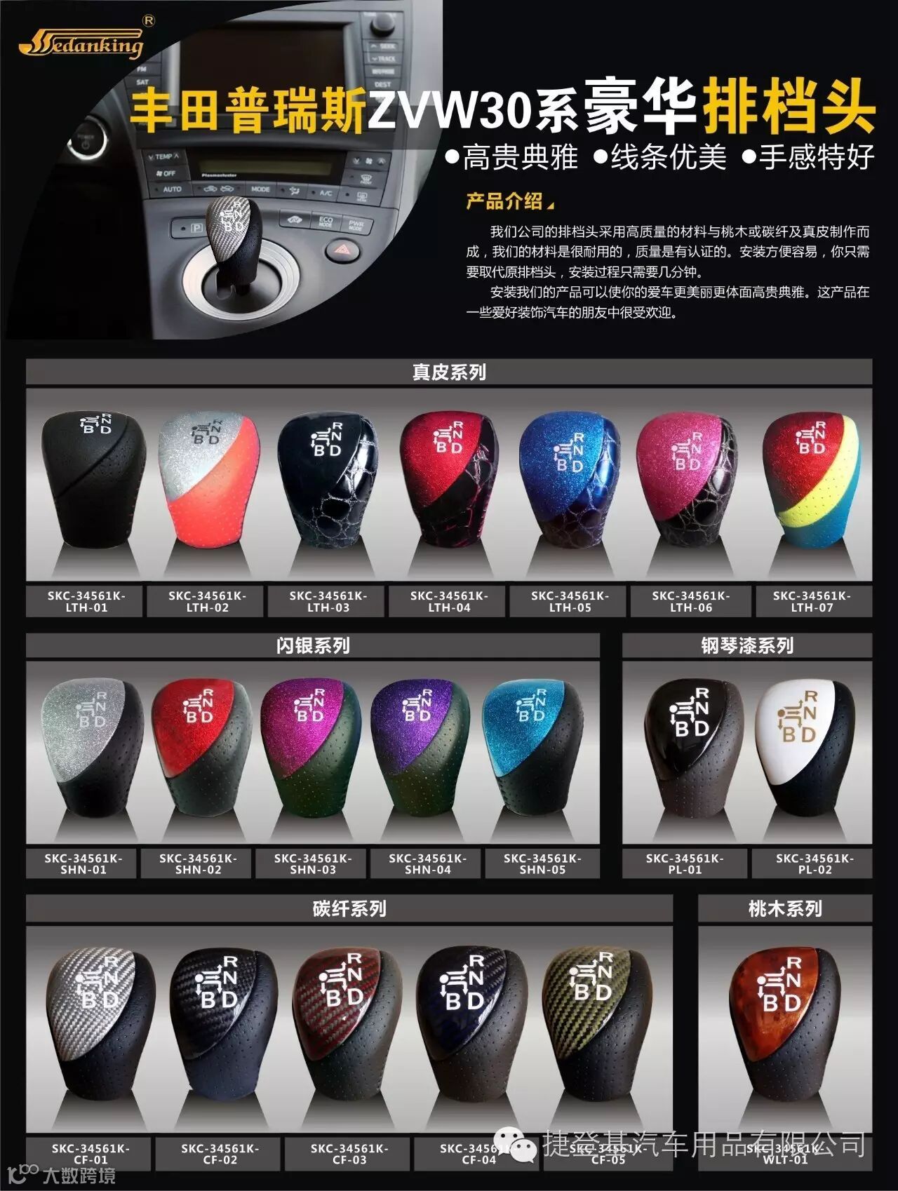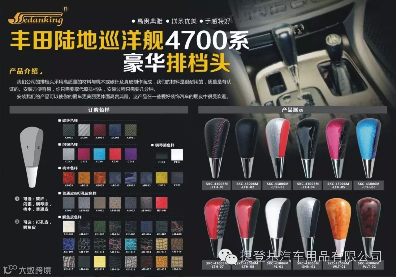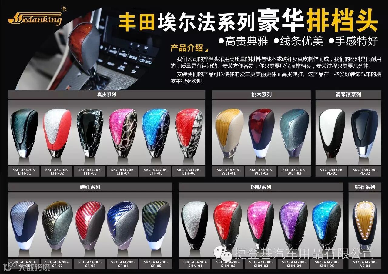 捷登基汽车配件有限公司是一家专业生产汽车内饰改装和替换件的专业工厂,我们今天给大家推介的是我们的主打产品之一-------豪华排挡头(波棍头)。