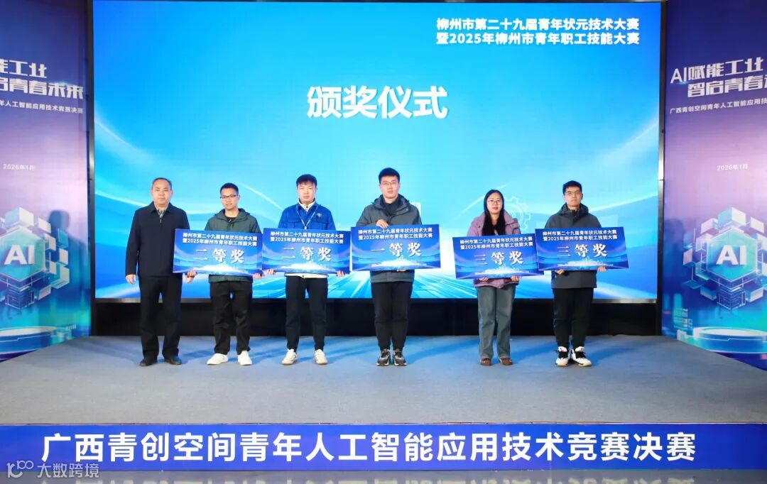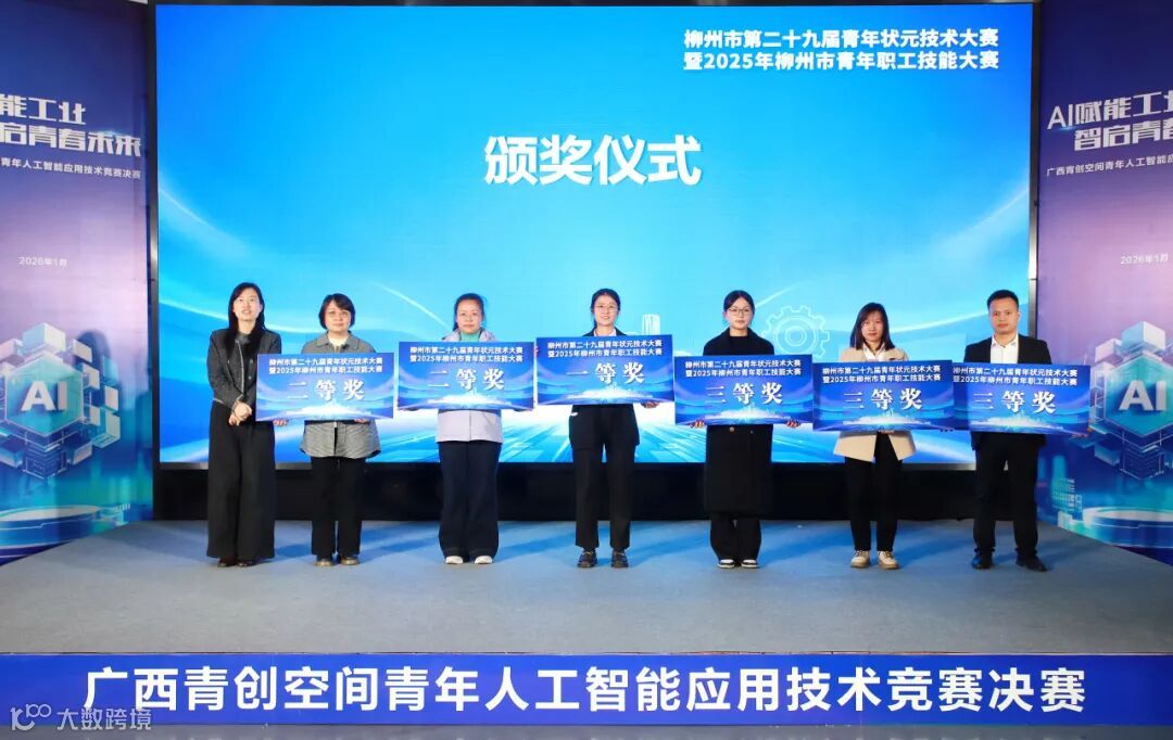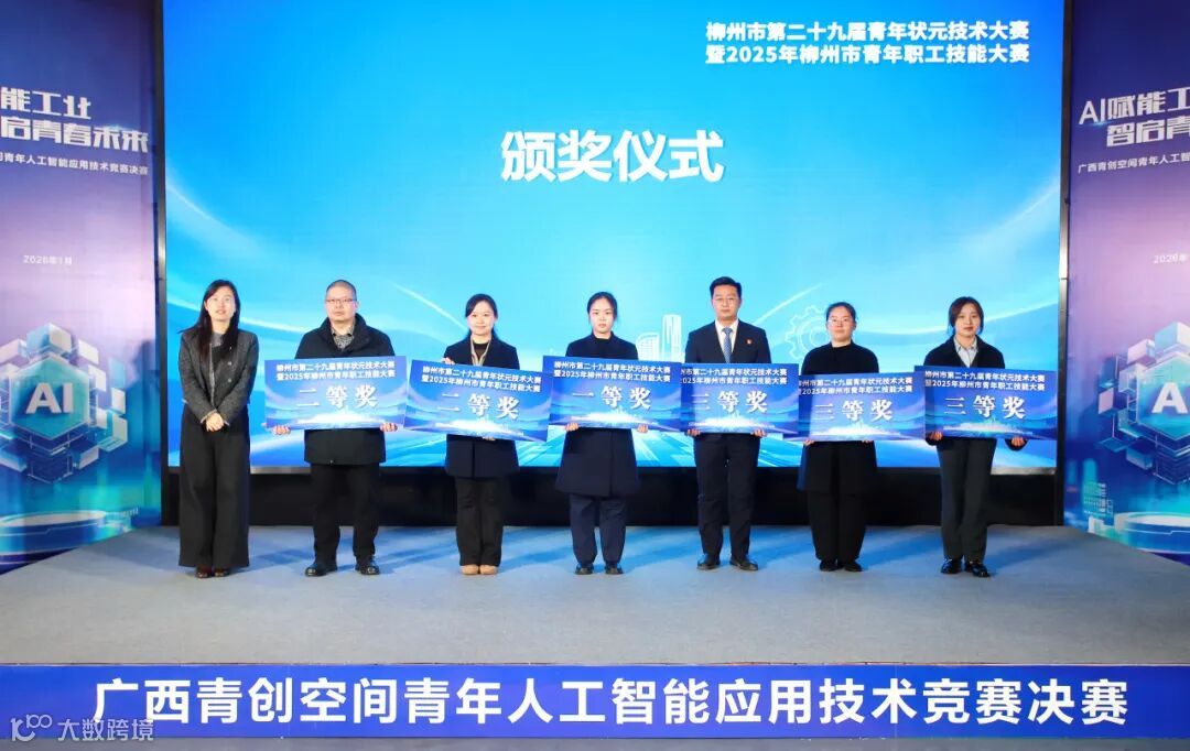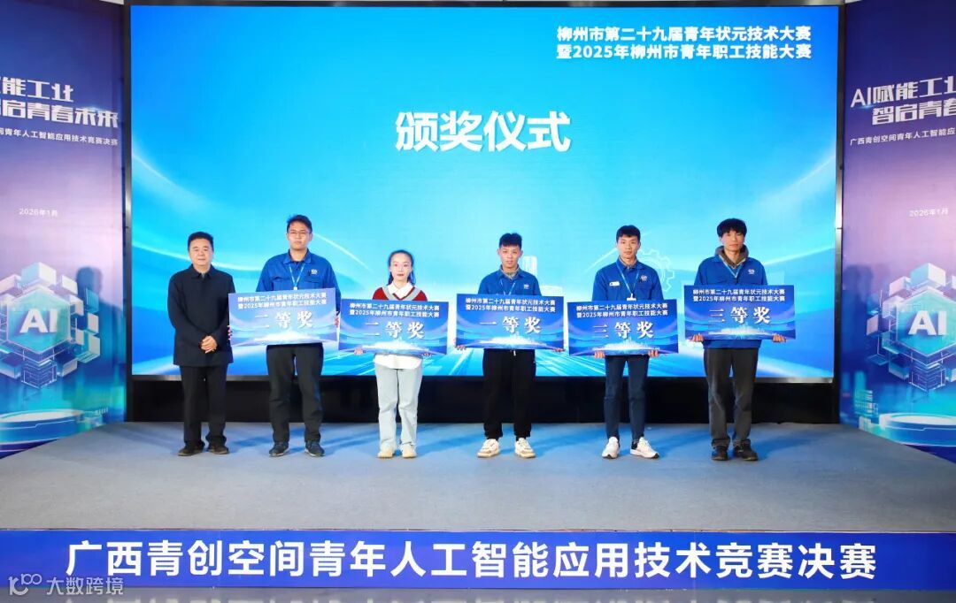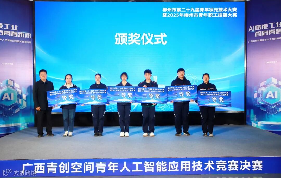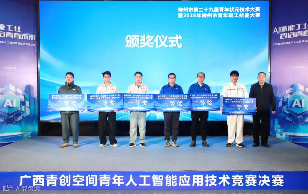 此外,现场还为第二十九届青年状元技术大赛暨2025年柳州市青年职工技能大赛的获奖代表颁奖。其中,在工业机器人运维赛项中,集团所属广菱技术赵天郎获得一等奖,罗振聪获得二等奖,集团所属五菱新能源陆刚剑获得三等奖。