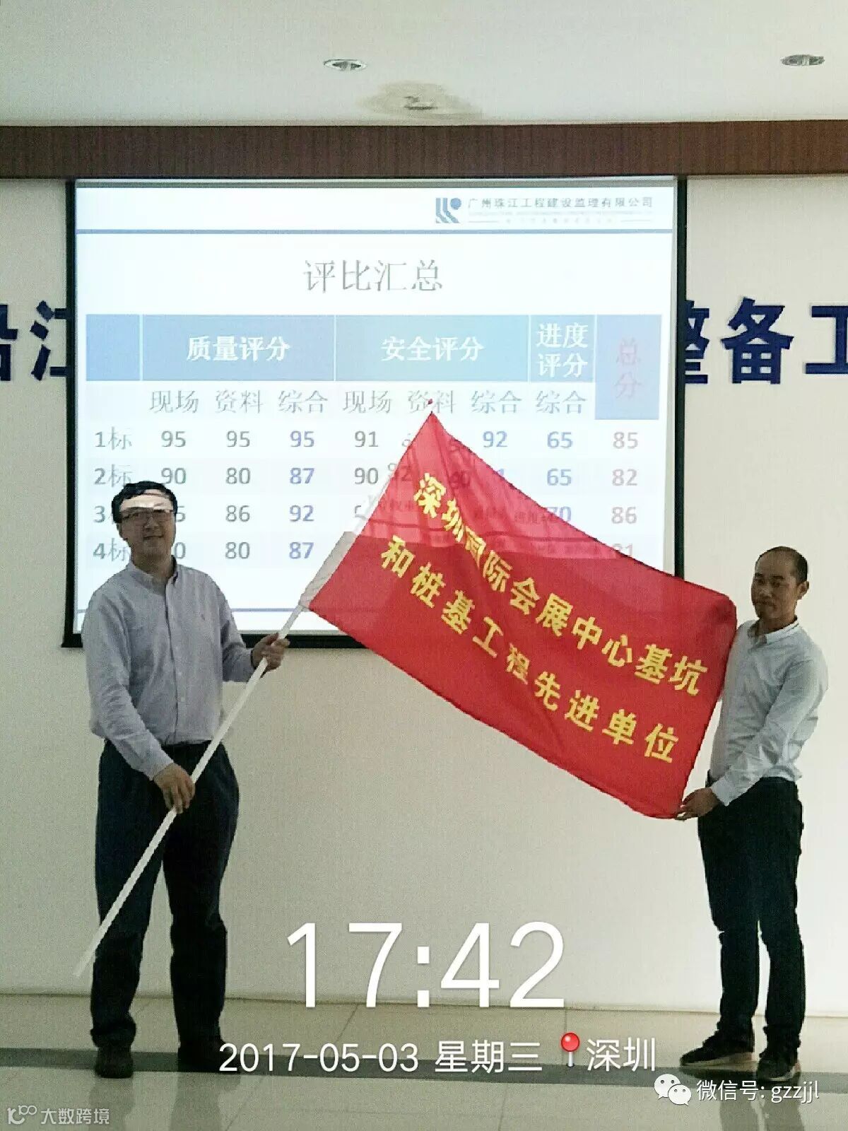 经过评比,四家单位广东潮通、深圳市建筑、深圳市工勘、深圳市基础综合得分为85、82、86、81分,竞争激烈,最终第三标段施工单位深圳工勘以微弱优势夺得本次评比活动的第一名,由建设单位授予先进单位流动红旗。