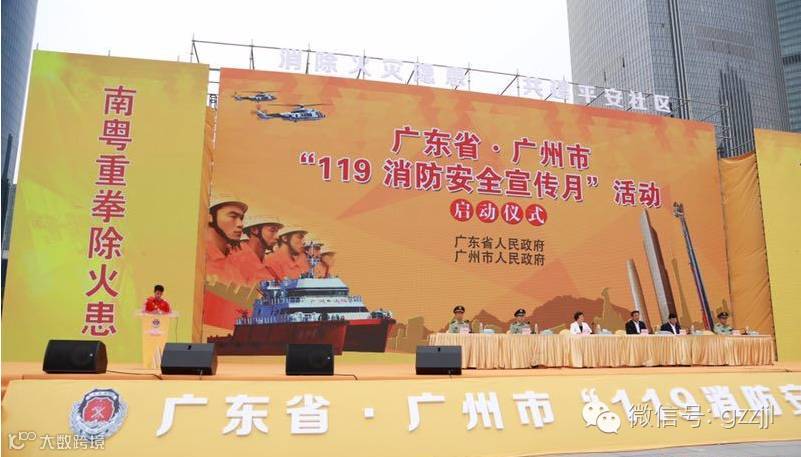 2016年11月9日是全国第26个“119消防日”。当天上午,广东省政府、广州市政府在市天河区花城广场隆重举行2016年广东省广州市“119消防安全宣传月”活动启动仪式。广东省人大常委会副主任罗娟,广东省副省长、公安厅厅长李春生,公安部消防局副政委詹寿旺,广州市副市长、市公安局局长杨江华,省公安消防总队总队长王郭社,政委黄远杰等出席活动。广东省籍奥运冠军张雁全、张洁雯受聘为广东省消防宣传大使。