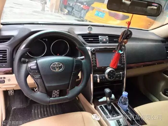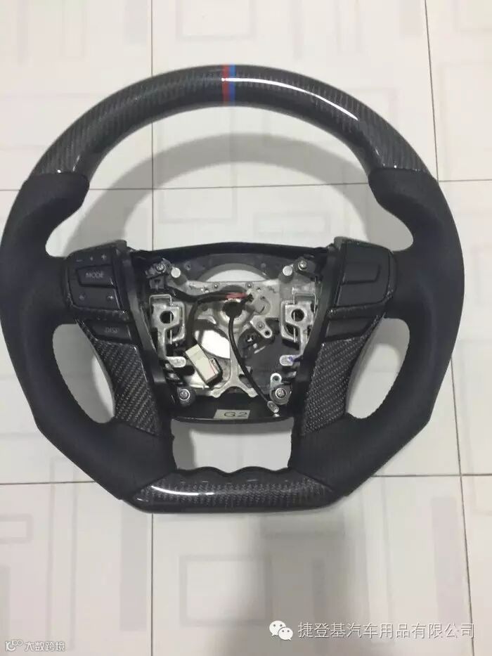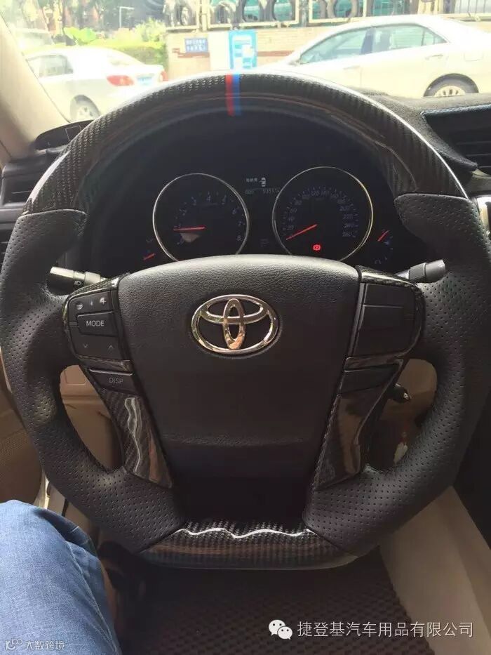 最这亮眼的方向盘改款,上下节加工碳纤,底下做有手指的凹位,起到很好的防滑效果。中间加红蓝线定位,两边手把改成运动款,并包打孔的皮,手感更为舒适。
