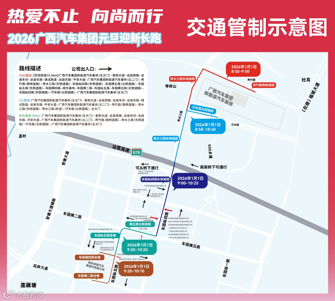 1月1日8:30—11:00,交管部门对广西汽车集团新能源汽车基地周边竹车路、秀竹路、秀水三路实行临时交通管制,并临时取消该路段道路两侧停车泊位。交通管制期间,禁止一切车辆驶入。秀水片区出行车辆可从秀竹路西段、官塘大道绕行进出。