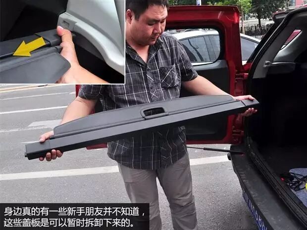 大多数SUV和两厢车的后备厢中会设置一个盖板,不仅可以避免车内物品被车外人看见,同时防止行李在行驶中散落至座椅上。盖板虽然看上去不大,但其实挺占地方的,一些大物件摆放会受到影响。其实盖板是可以摘除的,当我们需要摆放大件行李的时候,只要把两侧向里一退即可摘下。