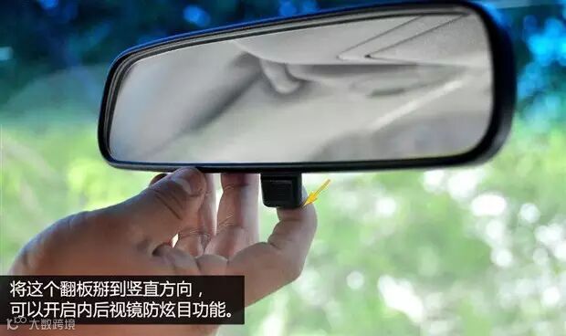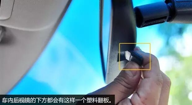 当我们遭遇后车开远光灯时,可以手动扳下车内后视镜下方的一个小翻板,此时在不调整后视镜角度的情况下可以达到防炫目的后果,大家不妨试试看。
