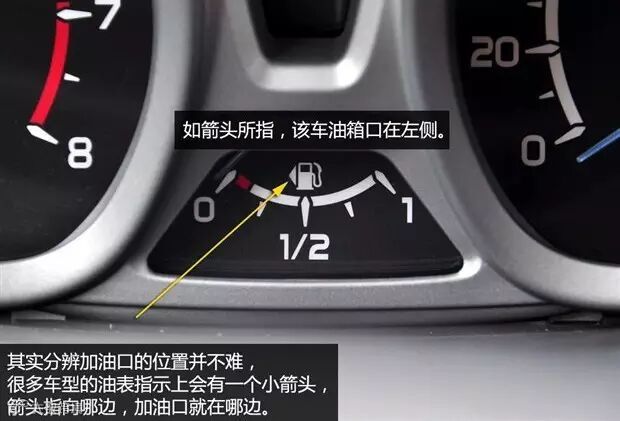 直到有一天一个同事教给了我一个方法才让我恍然大悟,大家可以注意观察自己车辆油表上会有一个箭头标识,这个箭头指向哪边,我们的加油口就在哪边。我们曾用不同品牌的车辆验证过,的确如此。不过个别车型没有这个箭头,就只能自己凭记忆了。