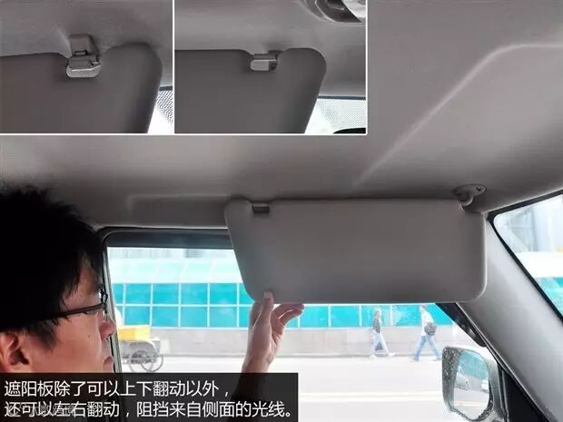 也许很多朋友不知道,遮阳板是可以向侧面转动的,当我们侧面面对阳光的时候,可以将遮阳板的一端旋转至侧面来遮挡两侧的阳光。
