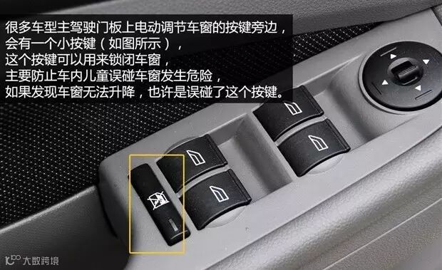 一些车主为了避免乘车的孩子或老人误碰了车窗发生危险,很多车型在主驾驶窗户调节的位置设有一个小按钮,按下它可以禁止其他车窗升降,起到保住乘客安全的作用。