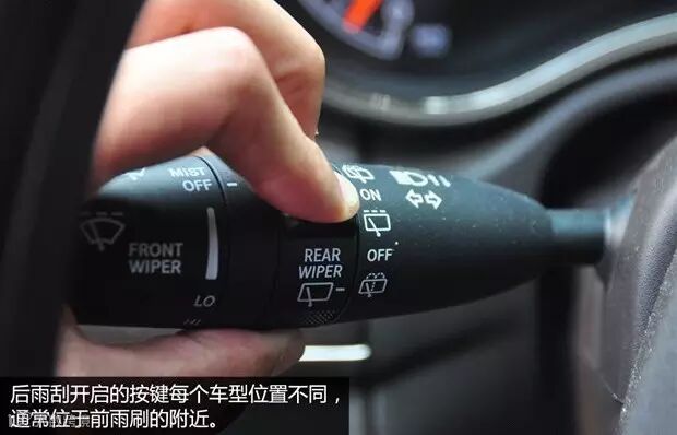 后雨刷刮水和喷水的功能按键通常和前雨刷位置接近,不过每个车型设计不同,大家可以观察一下方向旁两侧的功能杆。