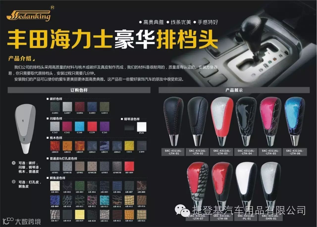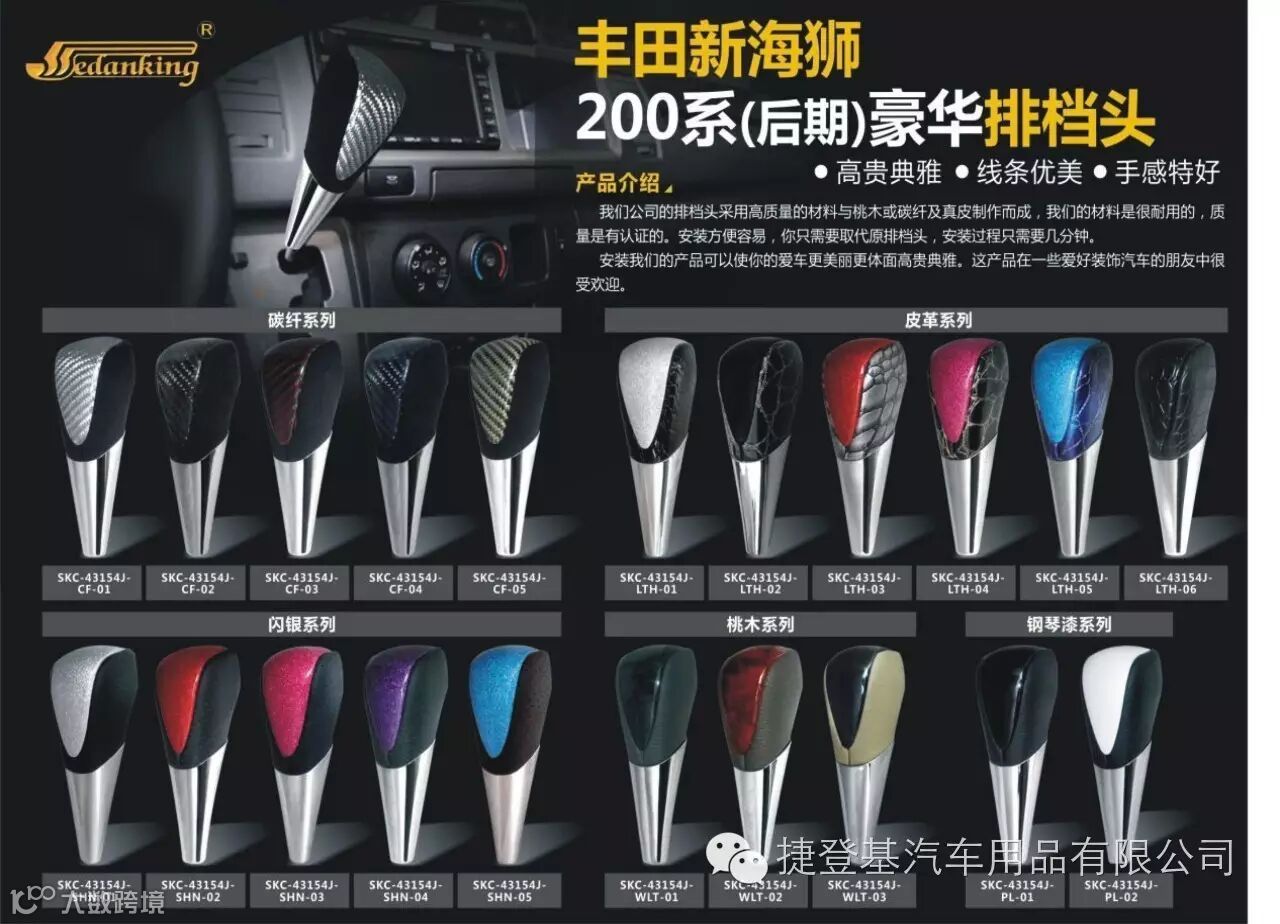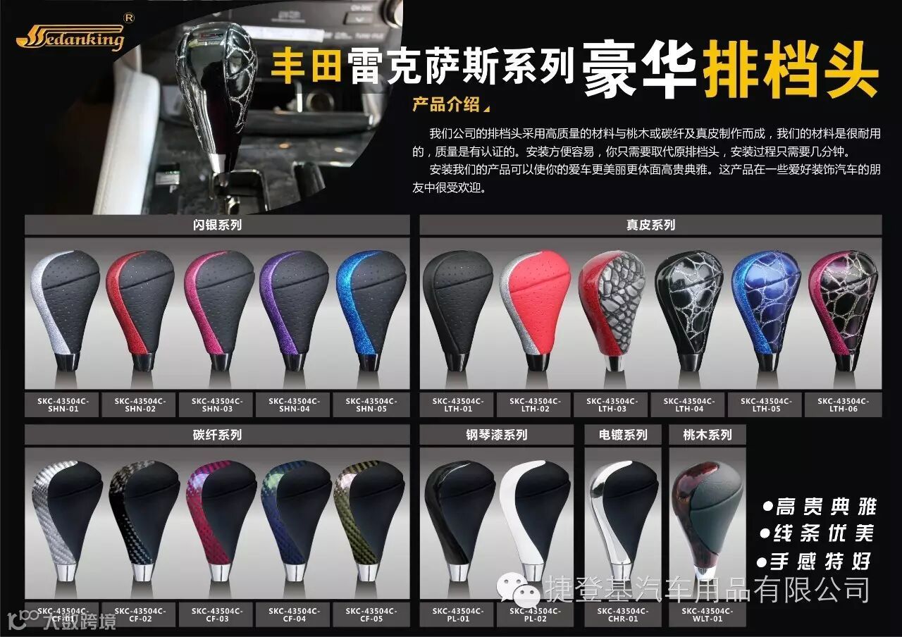 捷登基汽车配件有限公司是一家专业生产汽车内饰改装和替换件的专业工厂,我们今天给大家推介的是我们的主打产品之一-------豪华排挡头(波棍头)。