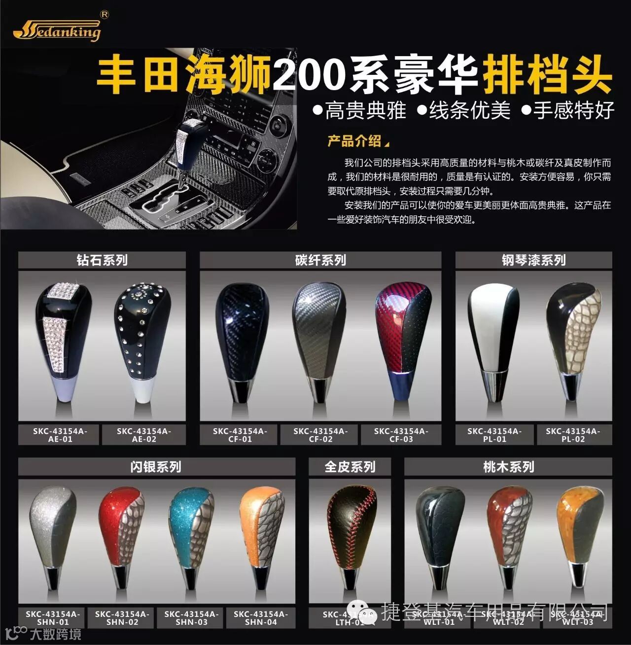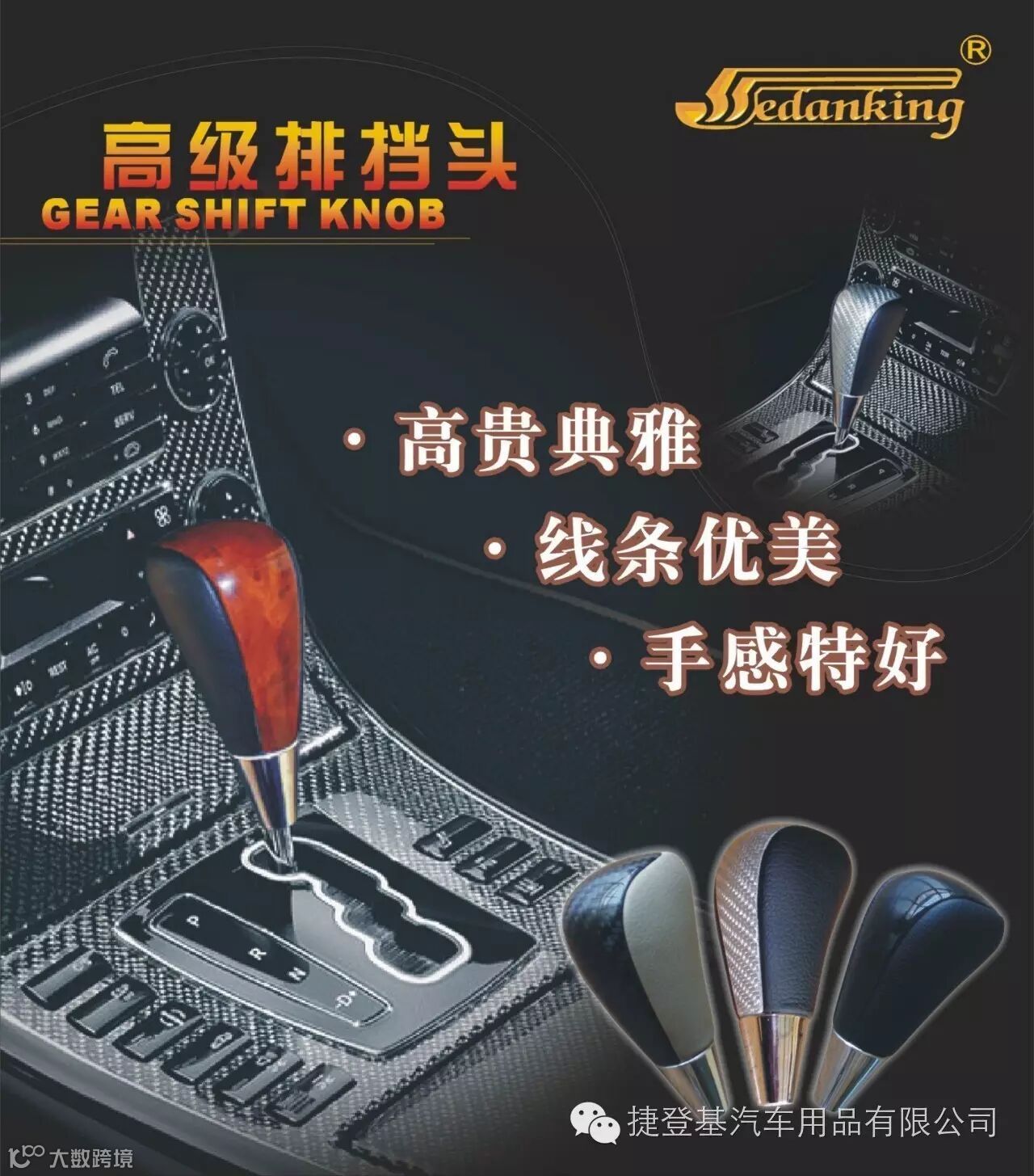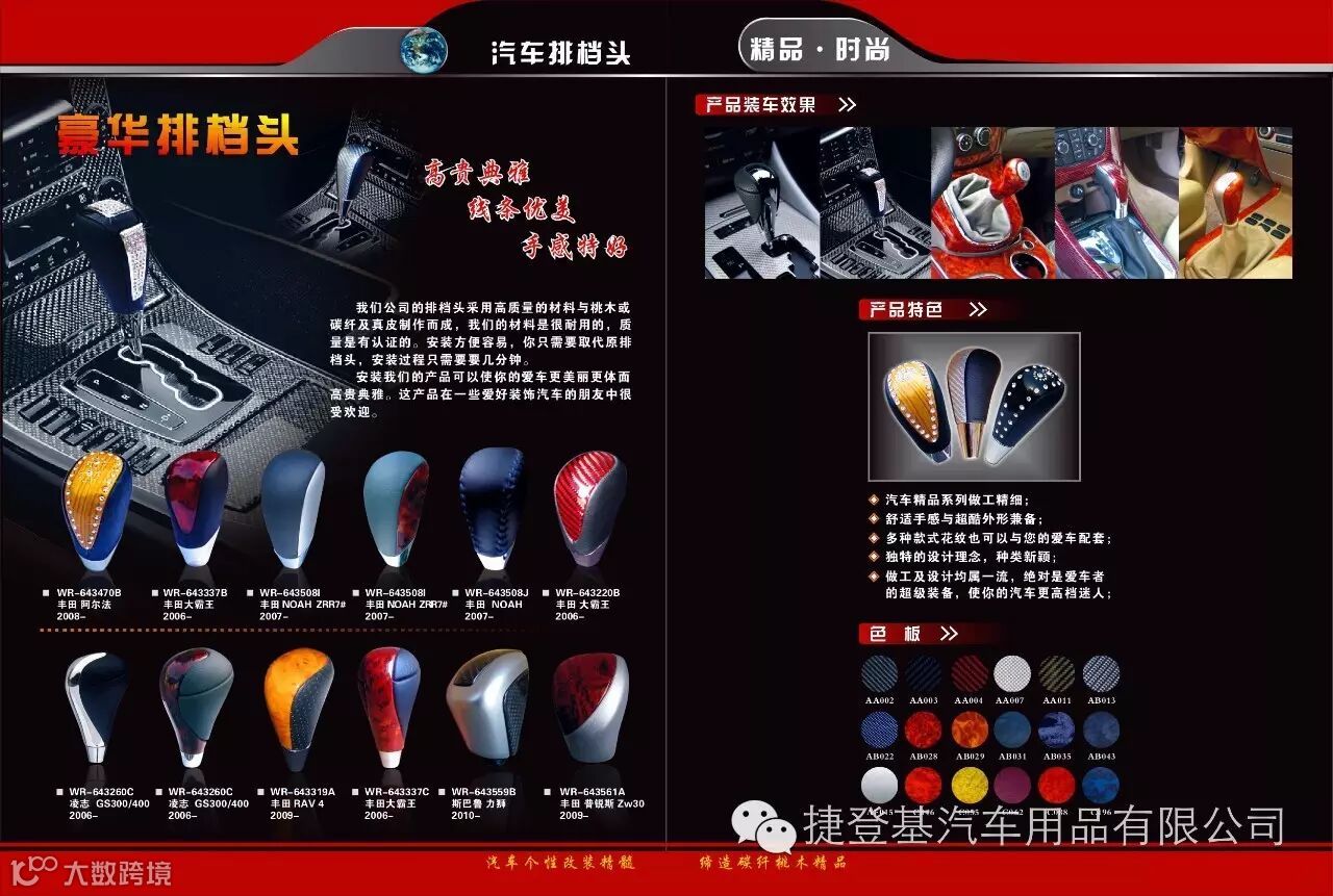 捷登基汽车配件有限公司是一家专业生产汽车内饰改装和替换件的专业工厂,我们今天给大家推介的是我们的主打产品之一-------豪华排挡头(波棍头)。