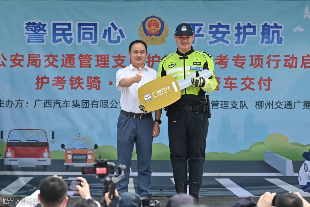 仪式上,魏明刚代表广西汽车集团向柳州市公安局交通管理支队机动大队指导员刘华递交钥匙。钥匙的传递不仅代表着30台警用摩托车的交付,更是责任与温暖的接力。这批警用摩托车将化身为爱心护考车,凝聚护航高考的赤诚心意,与柳州交警一同穿梭在龙城的大街小巷,为柳州万千学子保驾护航。