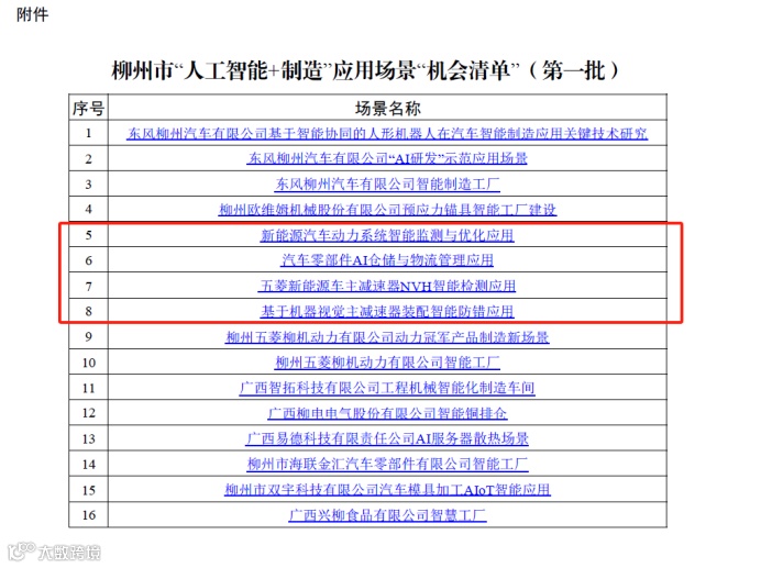 此外,《新能源汽车动力系统智能监测与优化应用》等4大应用场景入选柳州市第一批“人工智能+制造”应用场景“机会清单”。