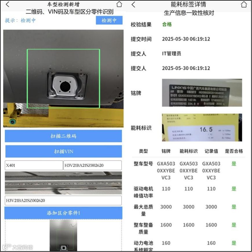 创新开发深度集成AI视觉能力的手持终端PDA系统,结合单据识别(OCR)快速录入技术,将整车VIN码刻蚀清晰度、铭牌信息准确性、发动机号与合格证数据一致性等整车关键信息进行智能核验,杜绝因信息错误导致的质量风险与合规隐患。