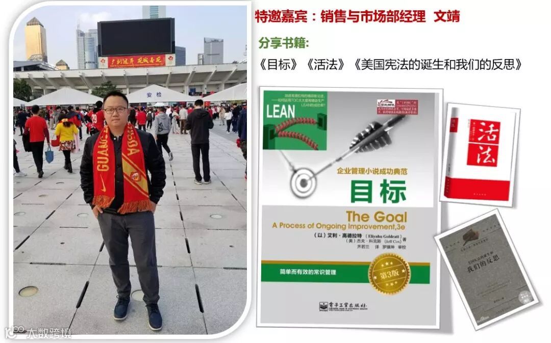 文经理与各位同事讲述了自己读书的三个阶段,并分享个人读书的方法和对读书的感悟。随后分享以色列艾利•高德拉特博士的著作《目标》,重点介绍TOC(Theoryof constraints)"瓶颈理论"及其九条原则和解决方案,随后文经理还推荐了日本稻盛和夫的《活法》和《美国宪法的诞生和我们的反思》。