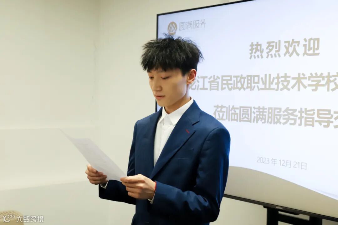 黑龙江省民政职业技术学校领导致辞,感谢圆满服务为毕业生提供的平台,希望与圆满服务建好建强实训基地,更好实现产教融合、协同育人。