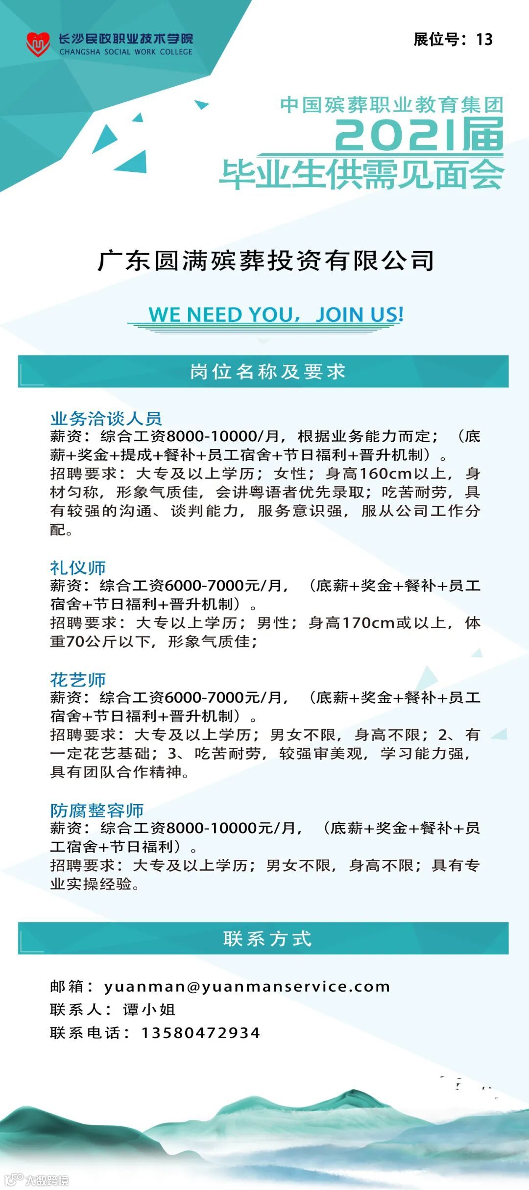 【2021届毕业生供需见面会】此外,本届大会还举行了2021届毕业生专场招聘会,吸引了109家殡葬企事业单位,为280名学生提供了1500多个工作岗位,切实为院校和企业深度合作搭建一对一交流平台。