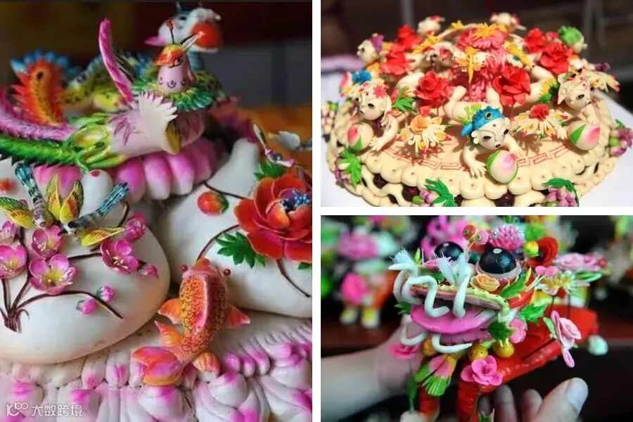 七月十五这天,山西的妇女流行捏面人,作为祭祖的祭品。“一家蒸花馍,四邻来帮忙。”她们会根据家庭人数,给每个人捏一个大花馍。花馍蒸熟以后,捏塑出各种形态,人形有童男、童女、寿星等,动物有牛、羊、猪、兔、鸡等,植物有石榴、桃、莲花、菊花等,再经过五色着彩,便可以称为绝佳的手工艺品了。