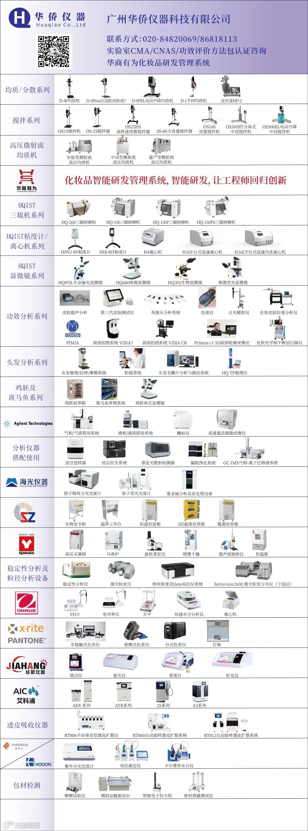 华侨仪器为化妆品事业而生,目前对于化妆品研发、质控、功效评价体系等,华侨仪器拥有目前最完善的仪器解决方案;根据化妆品的特殊应用,华侨自主研发产品包括三辊研磨机、粘度计、偏光显微镜等,质量都非常高,这些极具性价比的仪器,为化妆品企业降本增效提供支持,在软件和智能化方面,我们合作开发的功效评价软件和化妆品研发管理系统,市场占有率也是遥遥领先;在产品验证方面,包括研发、质控、功效通路如何协同,新品牌如何建立客诉体系,如何利用体系去管理代工企业做产品升级等,华侨仪器都有完善的解决方案,另外我们还专门成立法规和认证部,可以根据全球化妆品主要市场的技术规范,无论是出口还是内贸,无论是企业产品内控还是电商平台要求,华侨都可以提供体系认证咨询服务,并可以对于没有完善质控体系的企业,提供CMA和 CNAS认证服务,所以有华侨,化妆品高质量发展才能更好更快!华侨仪器就在你身边!