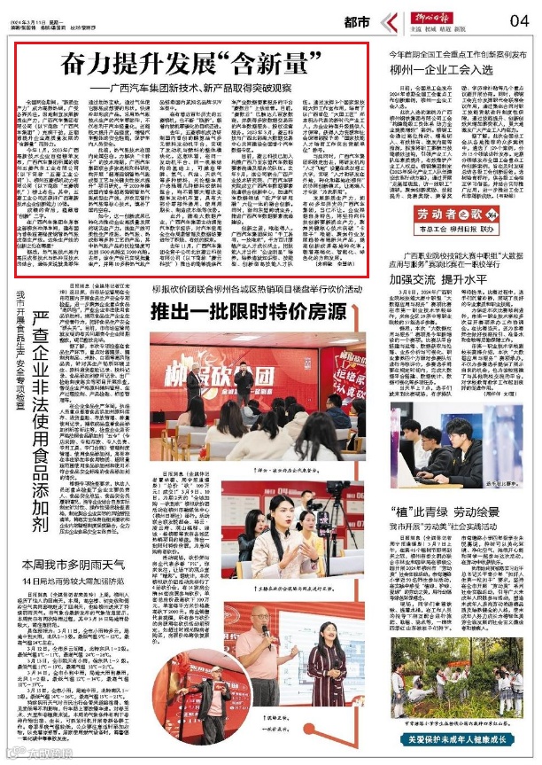 全国两会期间,“新质生产力”成为高频热词,广受各界关注。因地制宜发展新质生产力,广西汽车集团有限公司(以下简称“广西汽车集团”)充满干劲,正朝着提升企业高质量发展的“含新量”而努力。