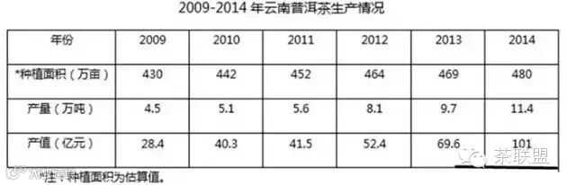 同时,据云南省茶叶流通协会推算:2014年,云南普洱茶种植面积约为480万亩,较2013年增20万亩,增幅4.3%;产量11.4万吨,增1.71万吨,增幅17.6%;产值101亿元,增31.4亿元,增幅45%。