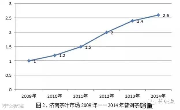 我们再看北方,在北方最大的茶叶批发市场--济南茶叶批发市场,普洱茶的销售量从2009年至2014年一路上扬。据统计:该市场内的普洱茶销售量自2009年至2010年提升了20%,至2013年则几乎翻了一倍,即使在2014年整体市场看淡的情况下,普洱茶销售仍高速增长。