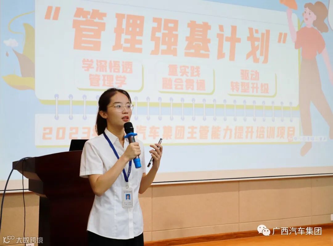 五菱工业公司专用车事业部何莹莹、五菱新能源公司电子电器及智能网联部蒋韬靖作为学员代表上台发言,表示要把所学的⼀点⼀滴的新知识与⼯作的实际情况结合起来,把理论知识运⽤于⽇常⼯作实践中,以实际⾏动在岗位上发光发热,更好的为公司发展服务,展现五菱人特有的风采。