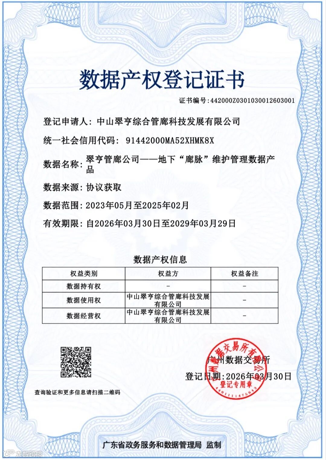 3月31日,翠亨集团所属中山翠亨综合管廊科技发展有限公司获得广州数据交易所《翠亨管廊公司——地下“廊脉”维护管理数据产品》数据产权登记证书。这一成果是科技能源板块以“科技赋能产业、绿色引领未来”为核心愿景推动集团高质量发展的生动实践与重要突破。