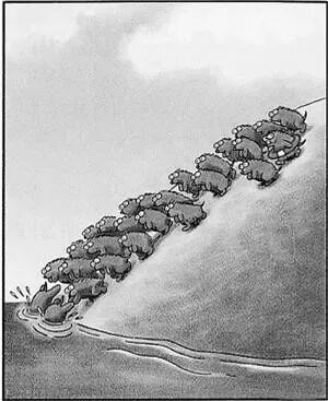 我相信车主将会使用某种独立搜集信息的形式来选择特定的饭店。他们可能以前就到过这里,或者看到过什么说明,或者听他们的朋友说过有这么一个地方。如果他们都使用与我相同的策略,将其他就餐人的数量作为饭菜质量的保证,我们可能都会对饭菜感到失望。在这种情况下,最先到的一批人是随意挑选的饭店,而接下来的我们就是盲目地追随他们的选择,就像电影《白色荒原》里从悬崖上如瀑布般倾泻而下的旅鼠一样。