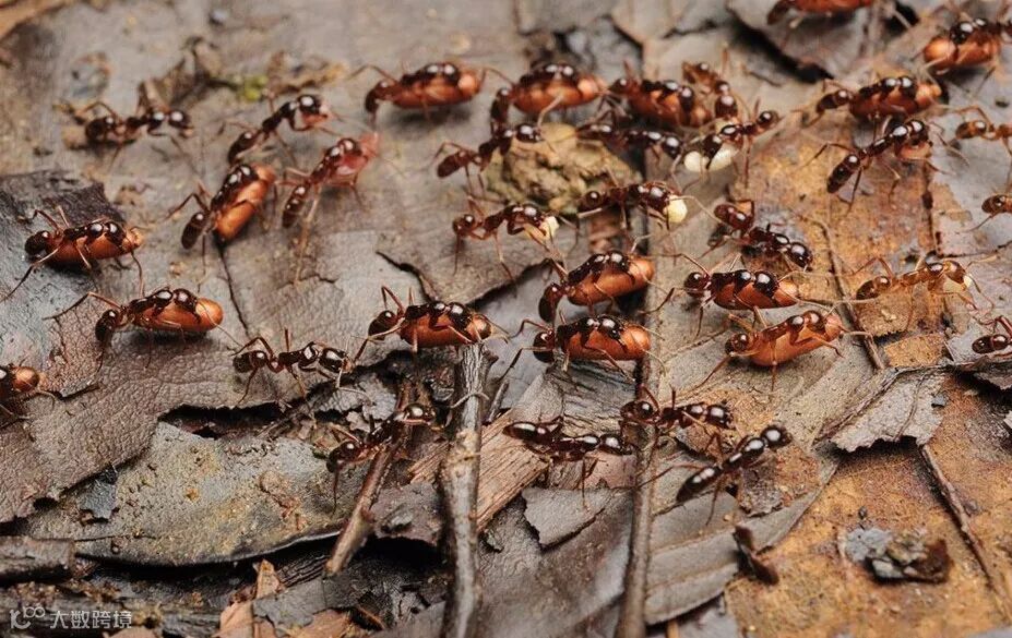 行军蚁群在从巢穴前往距离稍远的食物源的过程也会做同样的事情,它们会自行将队伍组织整齐穿越三车道高速公路。离开巢穴的蚁群占据了高速公路的边缘,而那些要返回巢穴的蚁群则搬运着食物行进在路的中间。