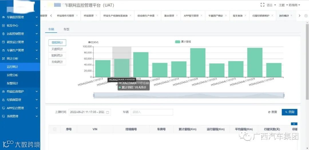 根据工信部39号令要求,需建立国家、政府、企业三级新能源汽车监控平台,实现数据的实时采集与传输,保障公众生命安全。为此,公司技术中心车联网科的技术人员全力以赴,耗时8个月自主设计开发出了监控平台,平台可满足国家GB32960法规要求,包括大数据网关接入、车辆监控、终端备案、车辆全生命周期管理、SIM卡管理等功能,实现车辆基础信息及实时信息的监控及管理,后续将用于公司新能源