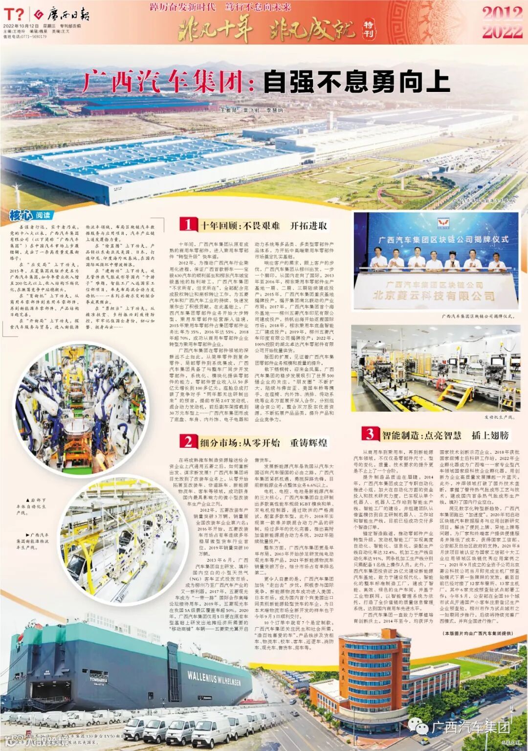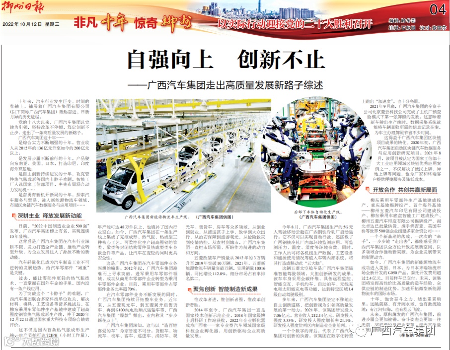 10月12日,《广西日报》和《柳州日报》推出重磅报道,以专题形式,全景式展现了广西汽车集团十八大以来,秉承“艰苦创业 自强不息”的企业精神,强基固本抓创新,勠力奋进谋发展,持续推动了广西汽车行业高质量发展。