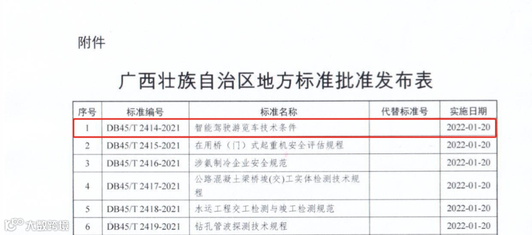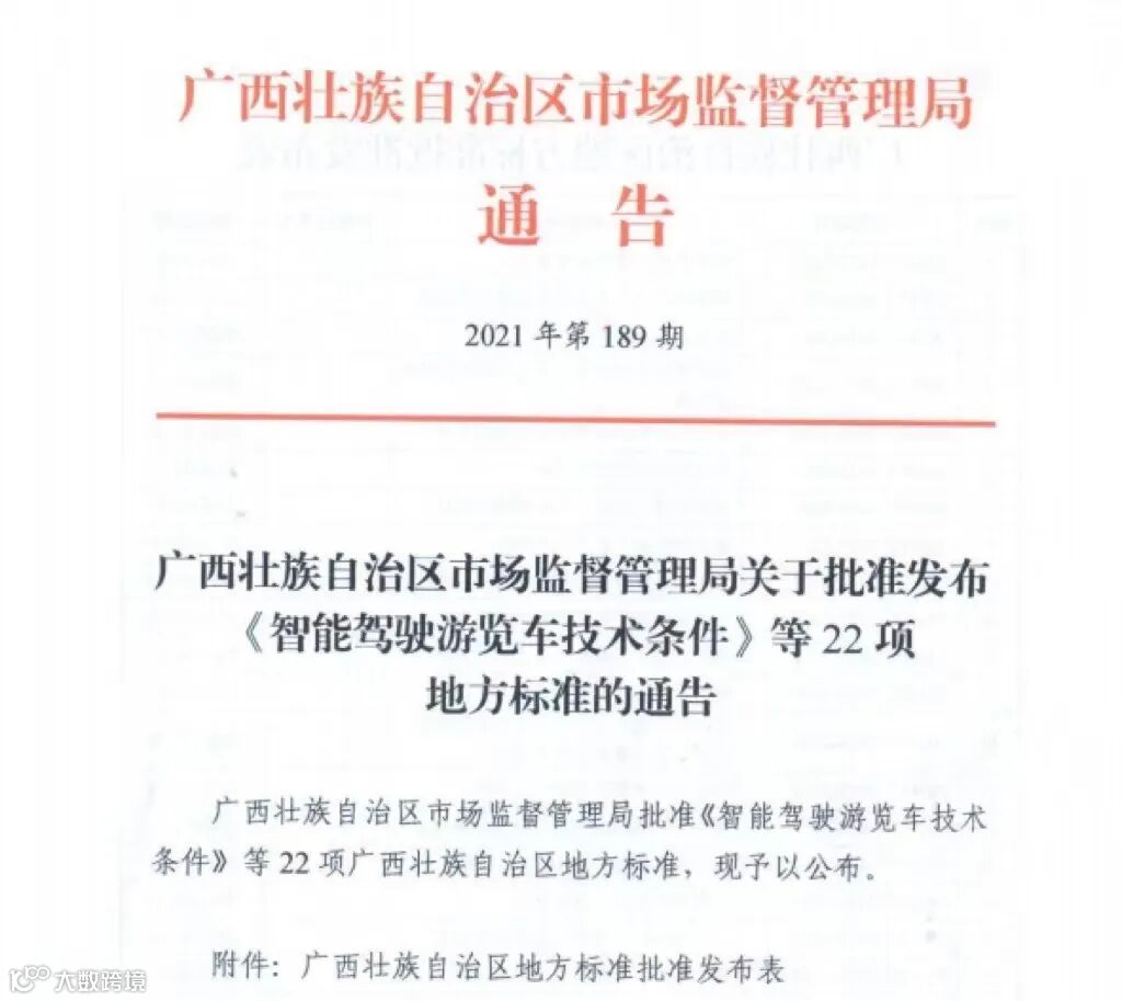 《智能驾驶游览车技术条件》地方标准的发布实施,为区内智能驾驶游览车技术提供了指导,将带动广西汽车产业向智能化、网联化转型,从而带动区域经济协调发展。