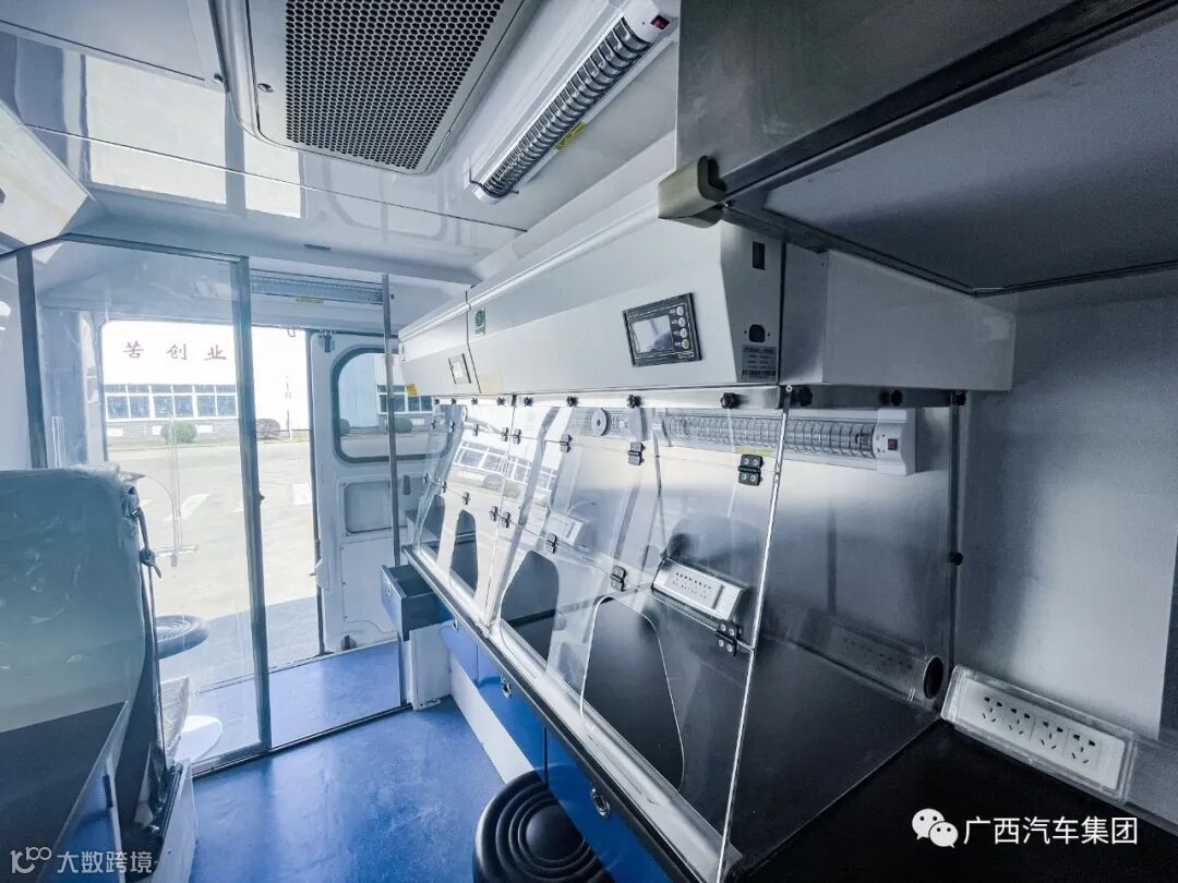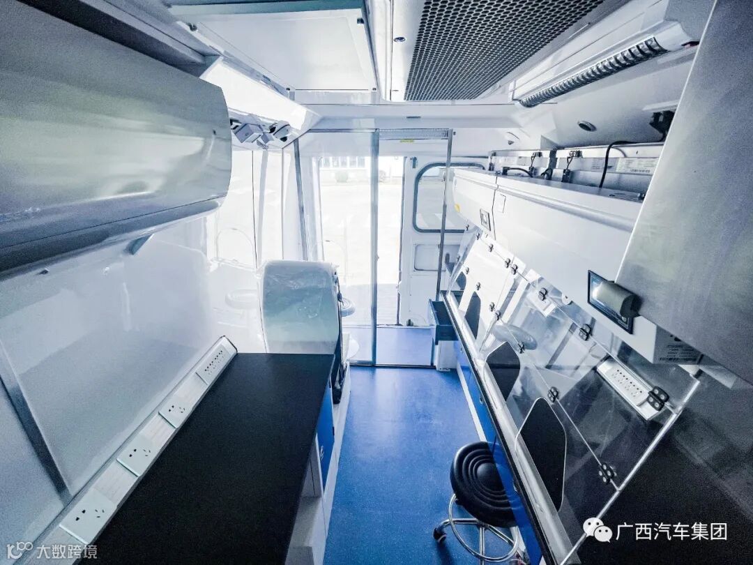 五菱发热诊疗哨点车严格按照生物安全实验室P2+要求进行研发设计,拥有负压系统、独立的样本传递系统、排水系统、独立空调、医疗废水废物收纳处理系统等,可搭载血常规检测仪、POCT(CRP)仪、微型台式振荡器、台式高速离心机等相关仪器,15分钟内完成检测,针对关卡、偏远地区等交通不便,设备不齐全等环境可快速完成检测。