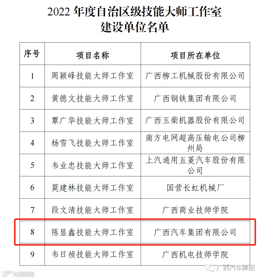 近日,广西人社厅发布《关于公布2022年度自治区级高技能人才项目建设名单的通知》,公司陈显鑫技能大师工作室成功入选2022年度自治区级技能大师工作室建设单位名单。