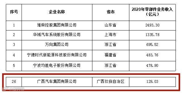 2021年中国汽车工业零部件三十强企业名单