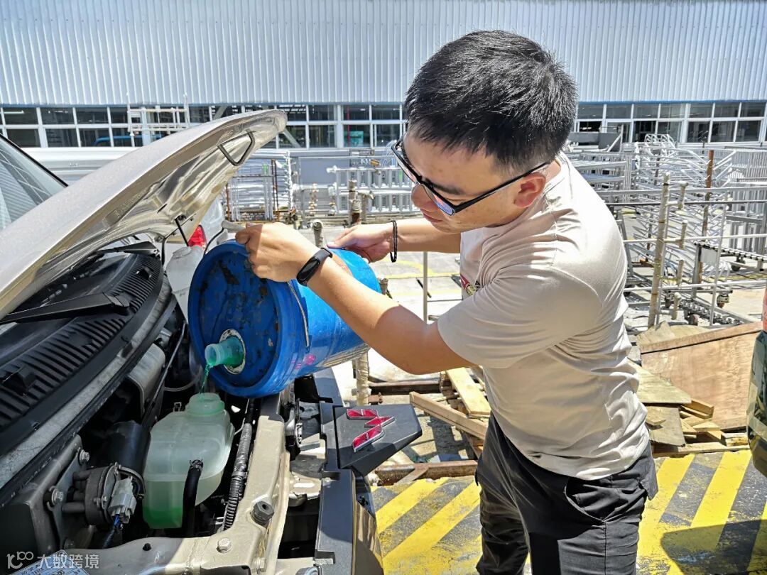 为了保证项目进度,确保样车能按时开展标定工作,技术中心工程师们顶着烈日第一时间对样车进行了样车评审,开展调试工作。图为工程师对样车加注冷却液。
