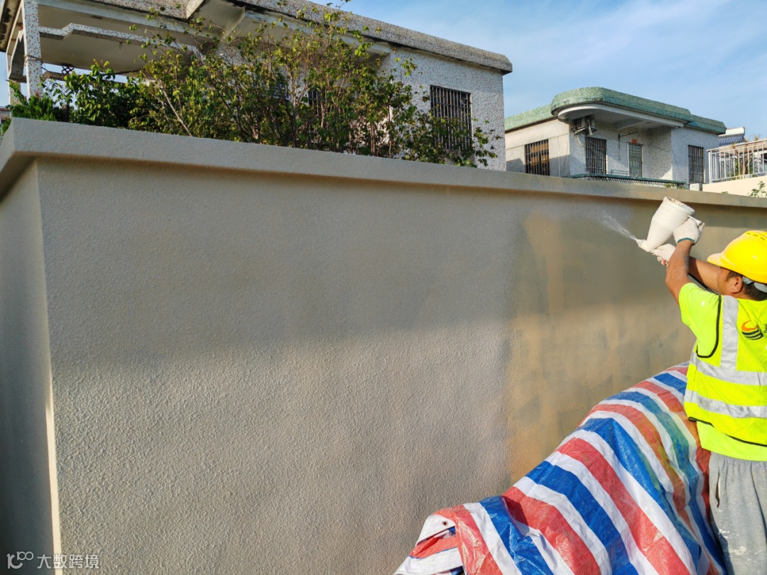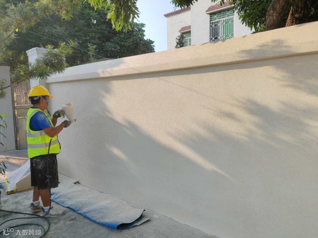 为了还原墙面的真实触感,施工人员选择精致度更高的真石漆,面层采用喷涂法施工,喷涂时喷枪嘴垂直于墙面且离开墙面30-50cm,通过调节空气压力和出漆量来控制真石漆的表面饰纹大小和厚度,使喷涂颗粒均匀,不出浆,涂层厚度一致。