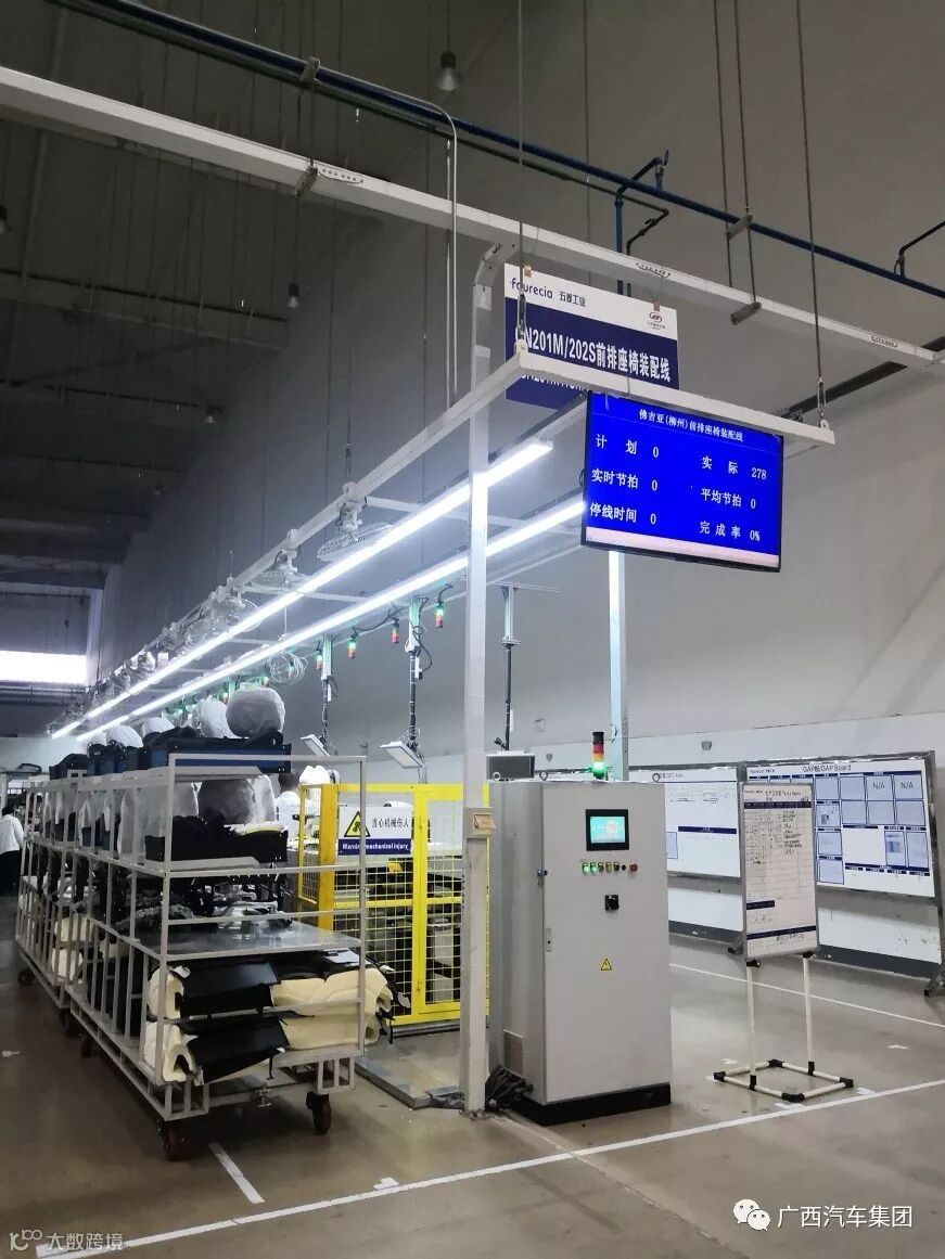 佛吉亚柳州座椅在柳东工厂新布局的整椅装配线,对安装工艺进行了改进,取消了线体照明灯及工位目视架的地面安装立柱,直接悬挂至流水线的上方。此方法便于生产物料的流转,也使得现场看起来更加的整洁。