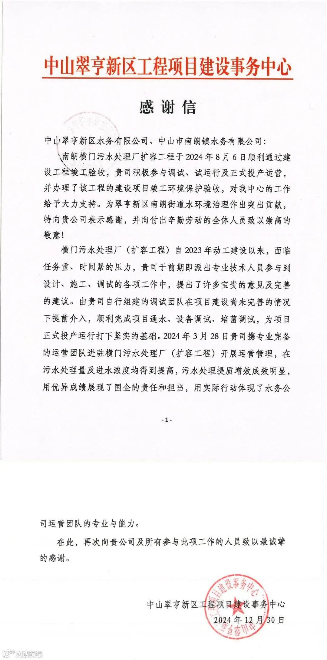 1月21日,水务公司收到新区项目中心感谢信,对该司参与横门污水厂扩容工程调试、试运行、投产运营等环节所作出的贡献表示感谢。