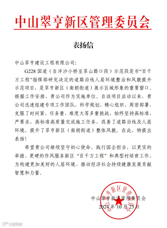 10月28日,翠亨建工公司收到来自中山翠亨新区管理委员会的表扬信,信中对翠亨建工作为实施单位,始终坚持高标准、严要求,高标准高质量完成G228 国道(自泮沙小桥至翠山路口段)示范段施工任务表示肯定,对翠亨建工公司为改善道路沿线及人居环境,提升翠亨新区(南朗街道)整体风貌作出的贡献提出表扬。