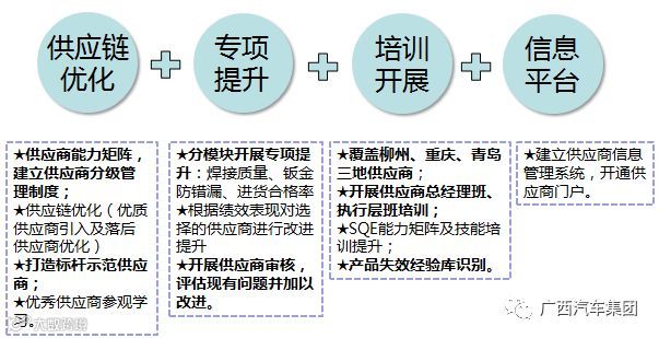 为进一步促进供应商伙伴发展,2018年五菱工业公司从供应链优化、专项提升、培训开展、信息平台四个方面,以內修外练为思路,通过内部管理流程及方法优化、SQE素质提升、供应商能力提升为载体,选择了35家供应商持续开展供应链提升活动。