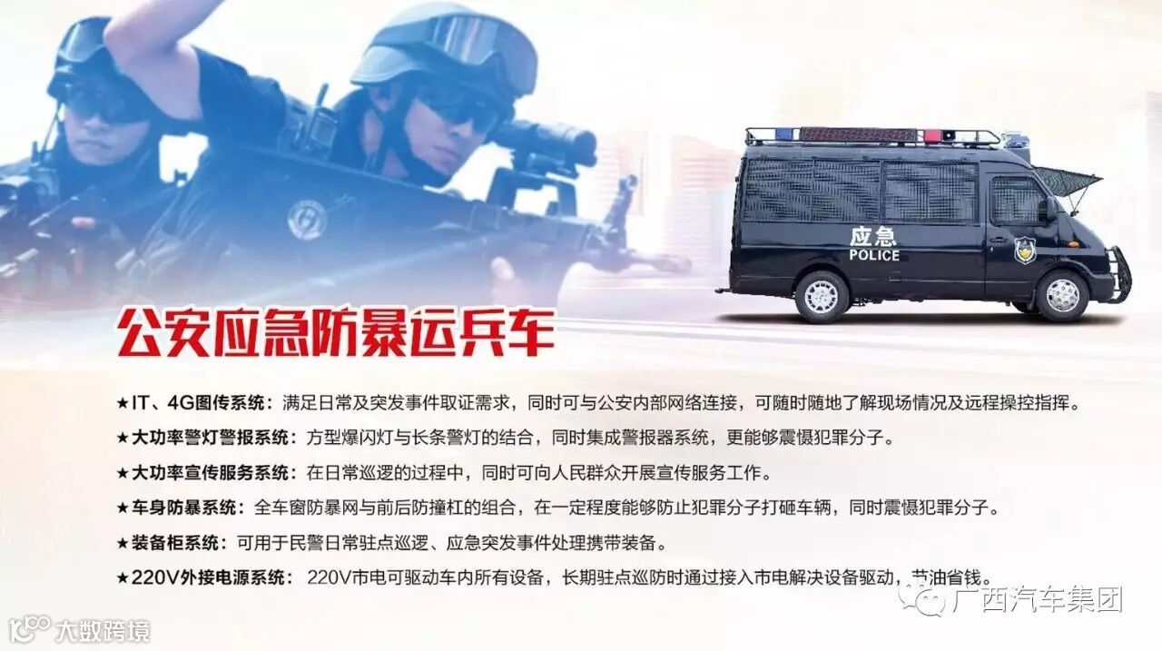 去年,公司为武警广西总队应急反恐任务,专业打造了“S100应急班防暴运兵车”。今年,针对公安警力、装备运输需求,公司又开发了“S100公安防暴运兵车·复合型移动警务工作站”,并成功交付给富川县公安局,后续将有望为其他市县公安机关单位服务。