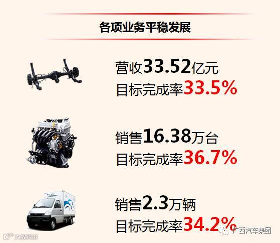 公司坚持以精益管理为主线,全面实施提质增效系列举措,各项业务平稳发展:汽车零部件模块营业收入33.52亿元,目标完成率33.5%;发动机模块销售16.38万台,目标完成率36.7%,整车方面销售2.3万辆,目标完成率34.2%,同比增长37.6%。