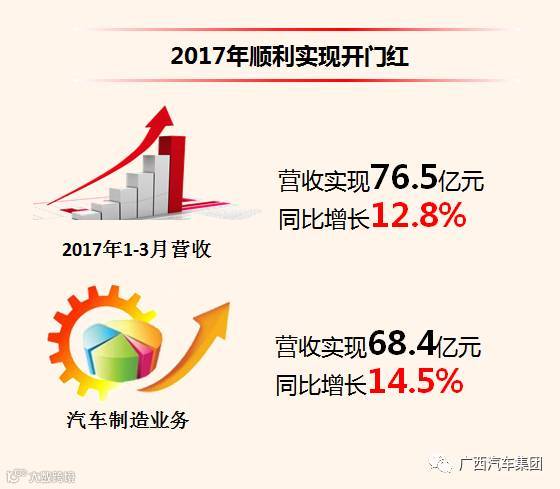 金鸡报晓催奋进,拼搏实干开门红!数据快报显示,集团2017年一季度营业收入实现76.5亿元,同比增长12.8 %,工业总产值实现45.1亿元。其中汽车制造业务营收实现68.4亿元,同比增长14.5 %。汽车服务与贸易业务实现营收8.03亿元。
